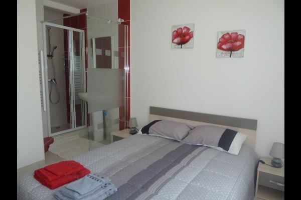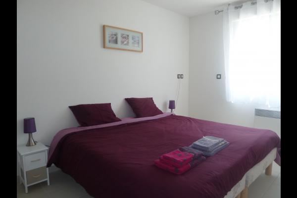 Logement de plain-pied pour 4 personnes, avec cuisine équipée, deux chambres avec salles d'eau, parking, et wifi gratuit. Idéal pour un séjour calme et tout confort.