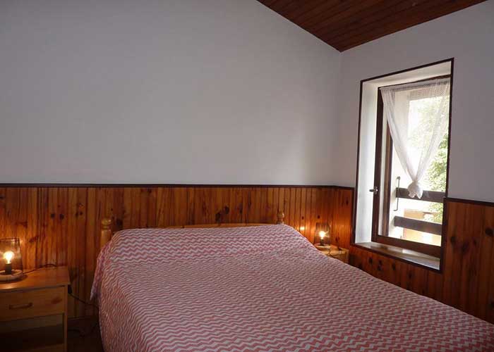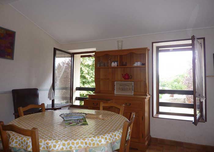 Au 1er étage, il comprend un séjour avec coin cuisine et TV, une salle d'eau, des WC, et deux chambres (une avec un lit double, l'autre avec deux lits simples). Le chauffage est électrique. Le terrain clos, commun aux cinq chalets situés à 20 mètres, et le parking communal en face offrent un espace convivial, complété par un terrain de jeux communal à côté.