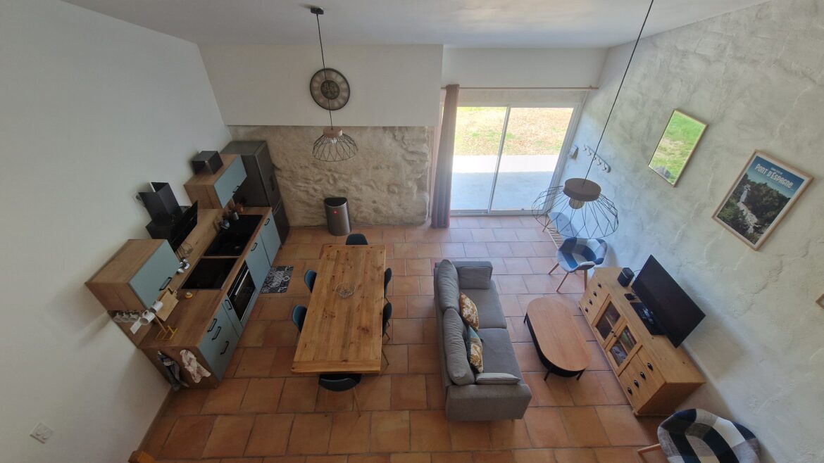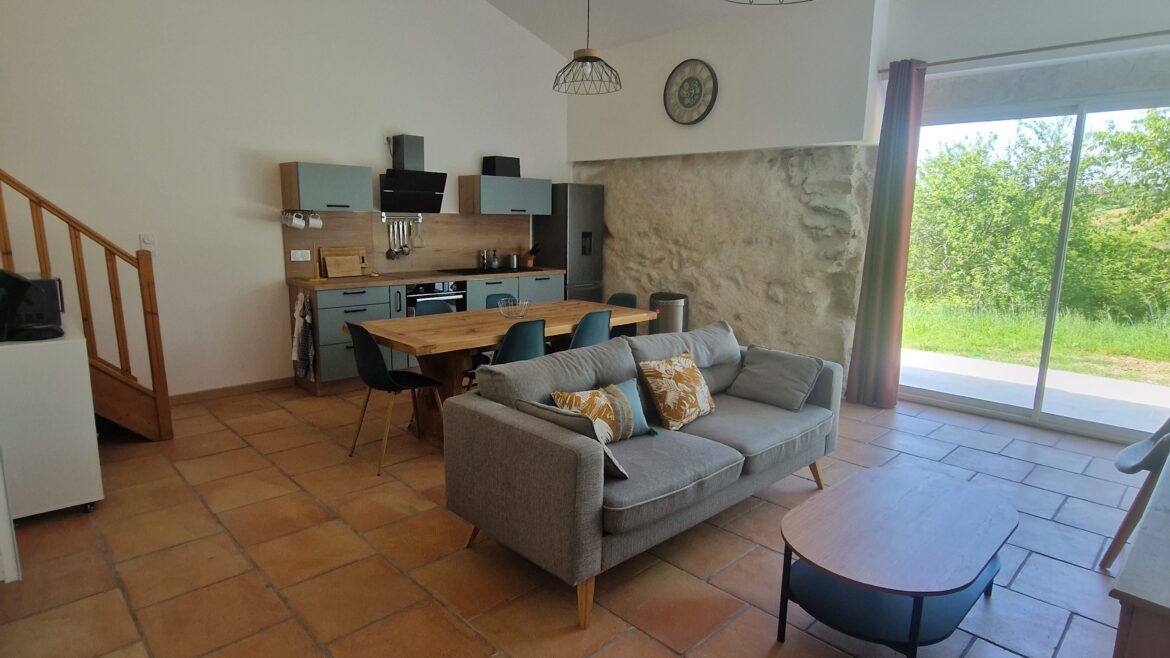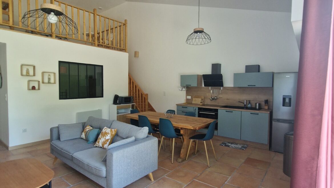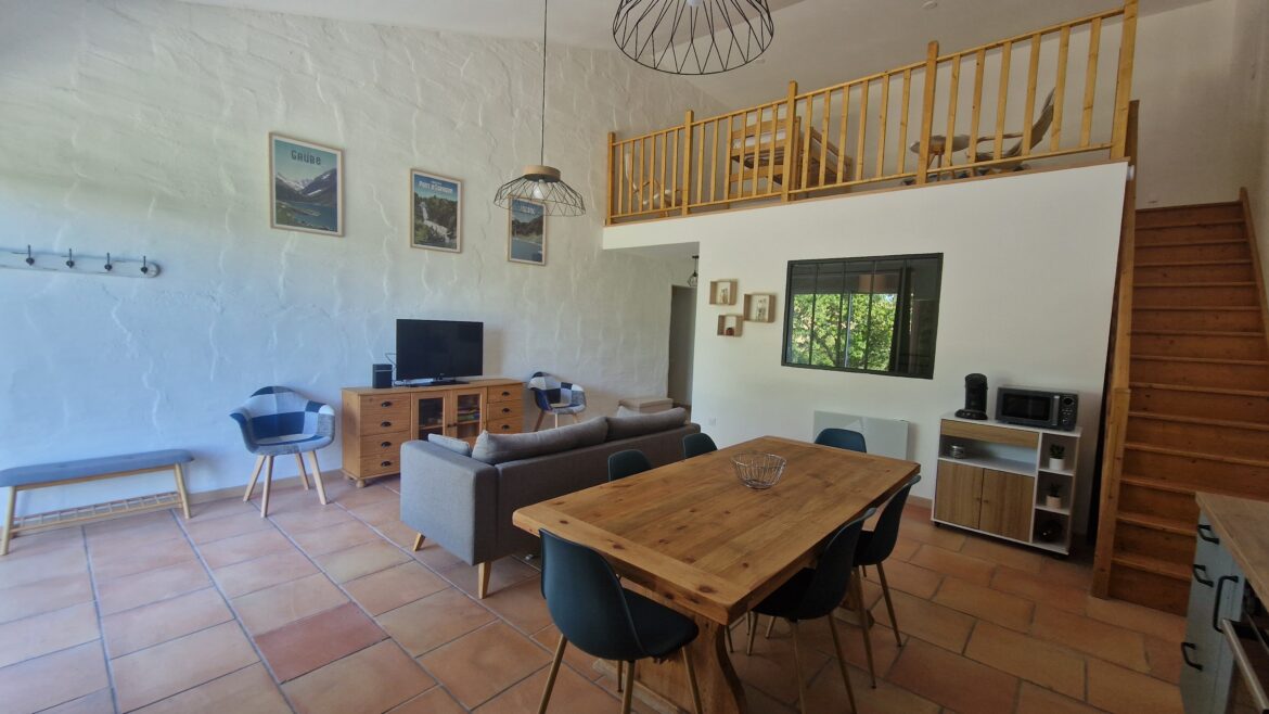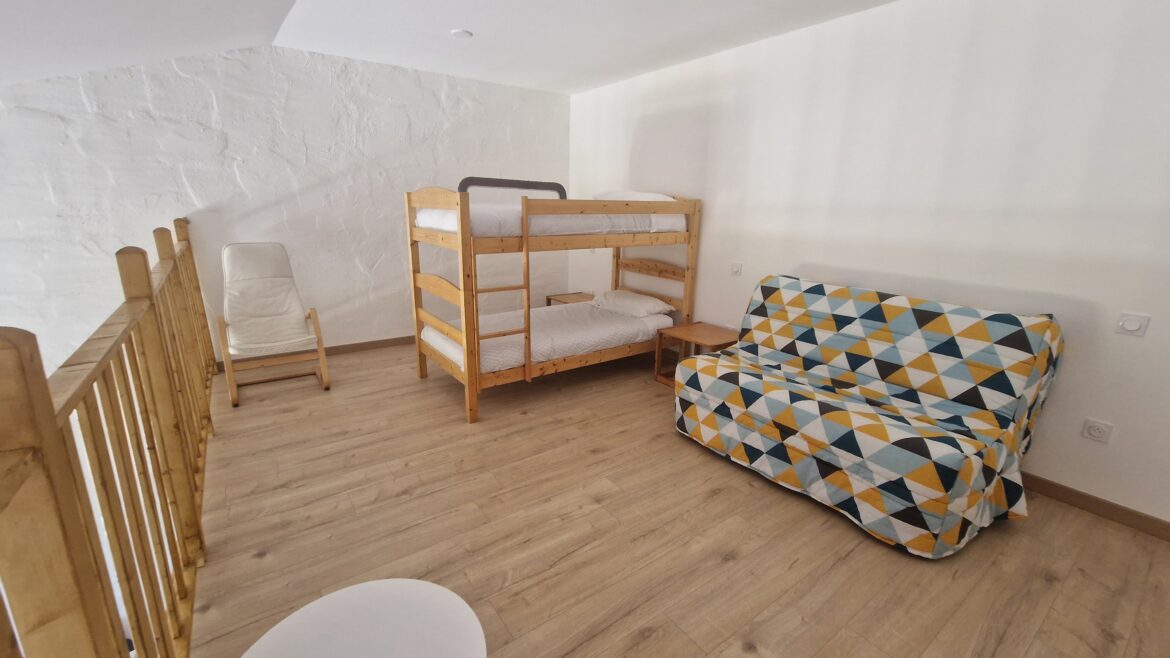 Le gîte dispose de 2 chambres avec lit double, 1 mezzanine pouvant accueillir 4 personnes (1 lit superposé, 1 canapé lit). Le salon dispose d’une cuisine toute équipée (frigo, four, lave vaisselle, machine à café) d’une télévision et d’un accès WIFI. La salle de bain est pourvue d’une douche et d’un sèche- cheveux.