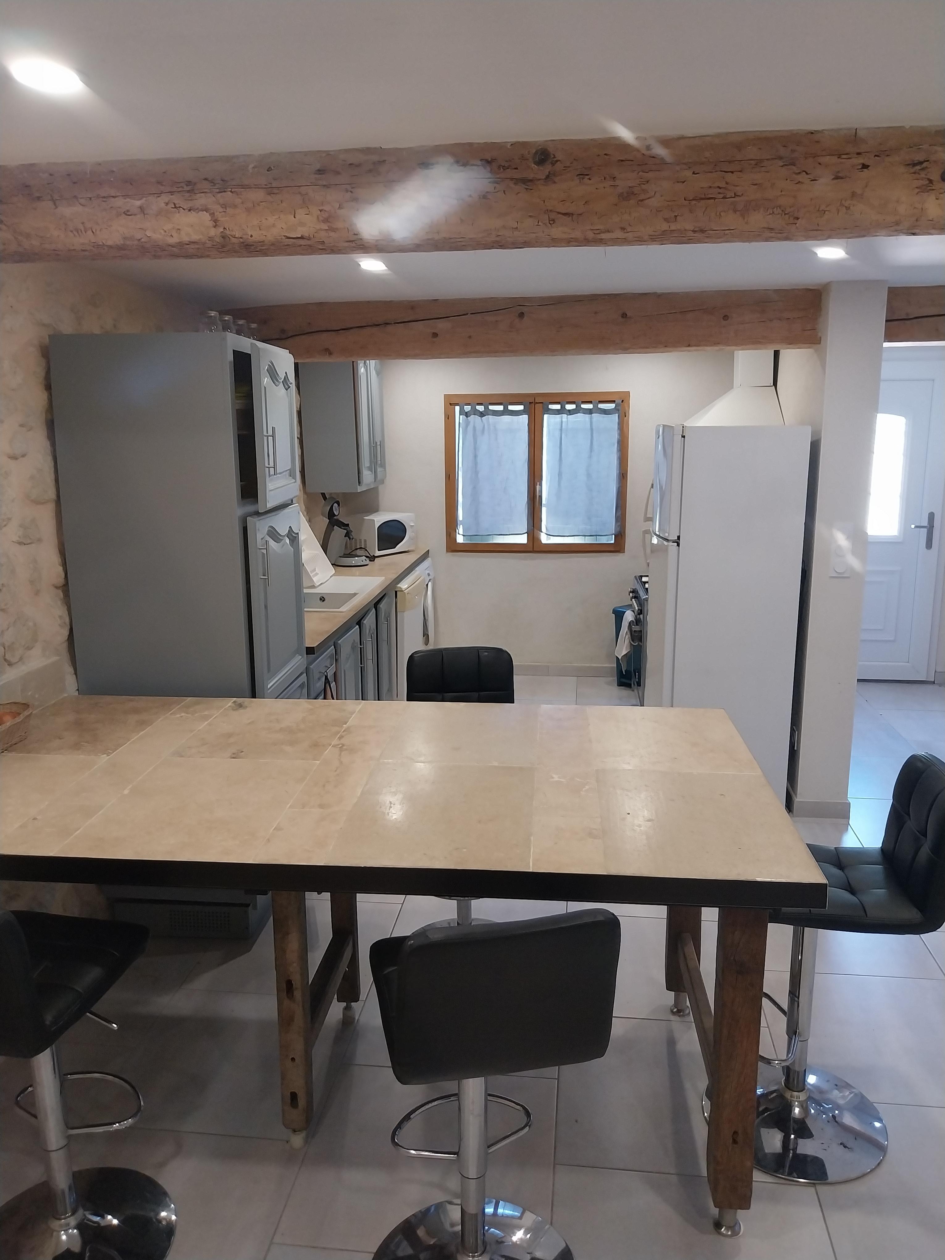 Cuisine équipée (frigo, piano de cuisson, lave-vaisselle, micro-ondes, cafetière, etc.).
