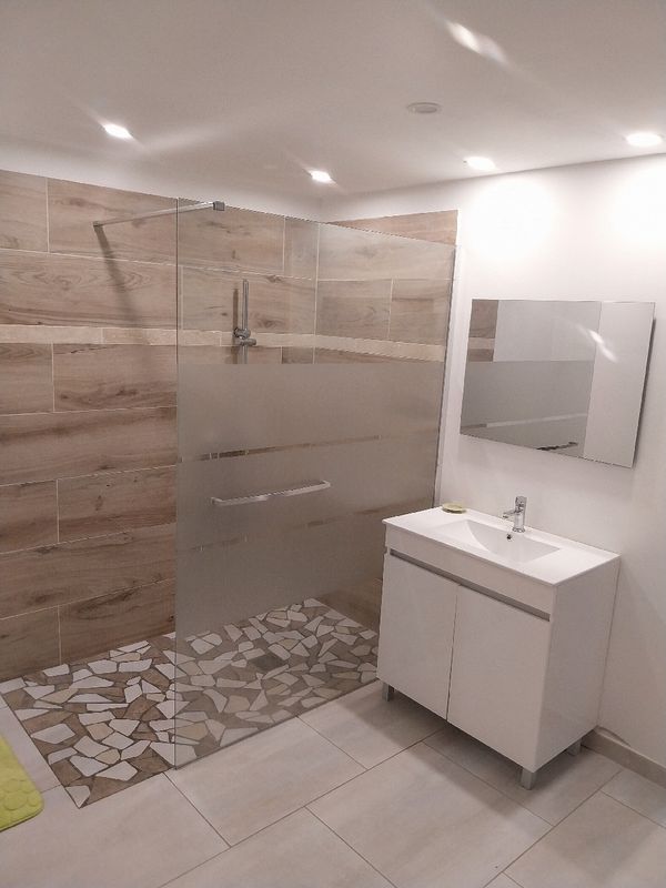 Salle de bain moderne (douche à l’italienne, sèche serviettes).