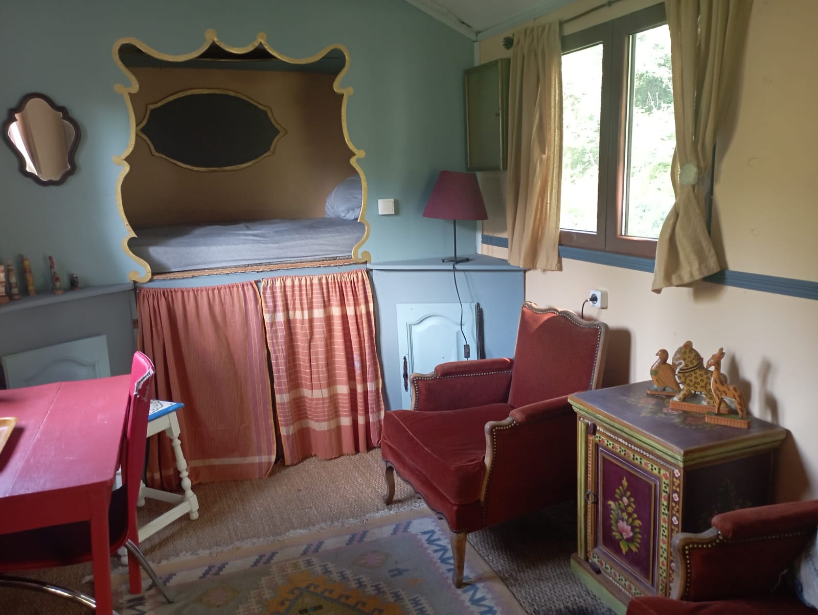 Durant votre escapade insolite, vous disposez d'une roulotte confortable de 15m² composée de deux lits doubles superposés, d'un salon/bureau et d'une petite terrasse, et à côté d'un bloc sanitaire et d'une cuisine.