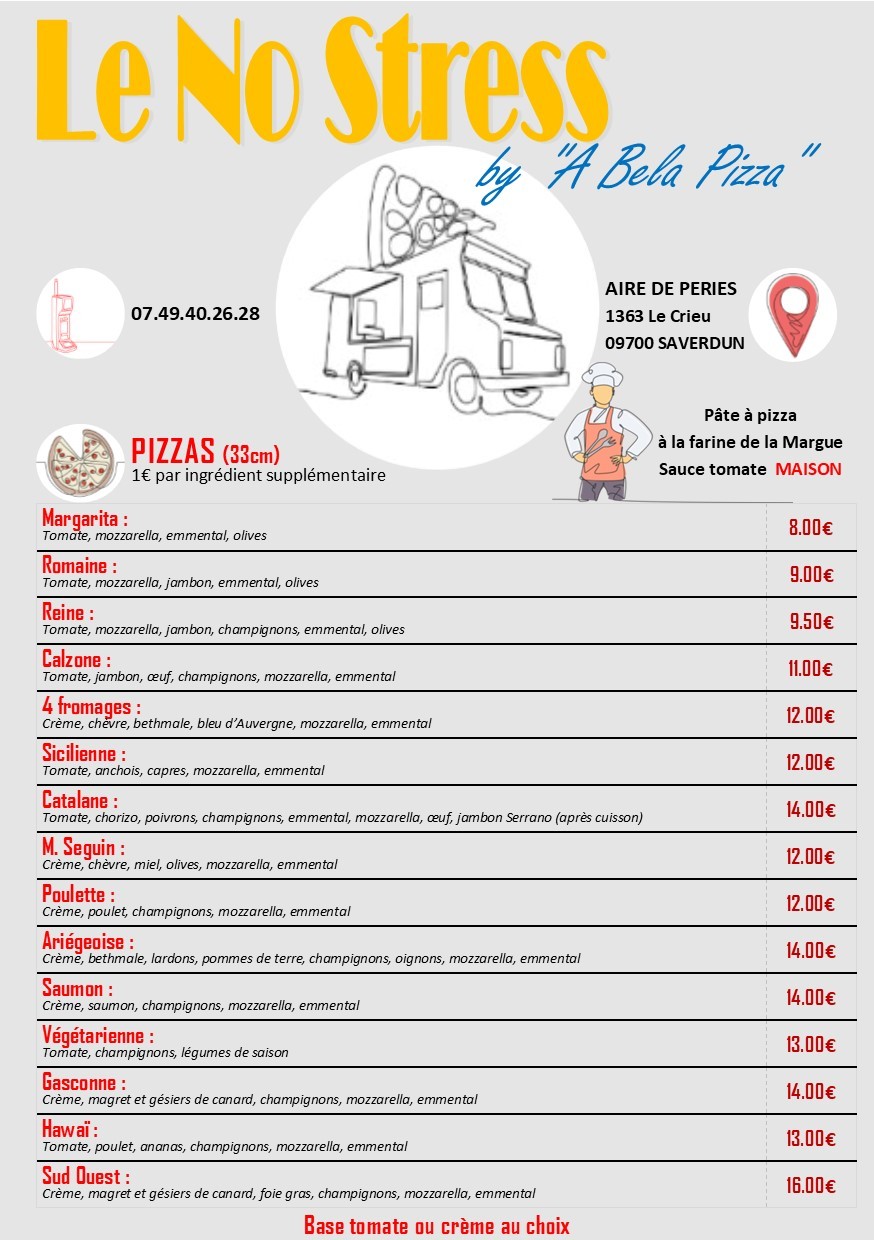 Situé sur l’aire de repos de Périès, à la sortie de l’autoroute et à l’entrée de Saverdun, le Snack Le No Stress est l’endroit idéal pour une pause gourmande avant de reprendre la route. Dans cette structure fixe avec une agréable terrasse, Alexandre vous accueille avec une cuisine maison préparée à partir de produits frais.