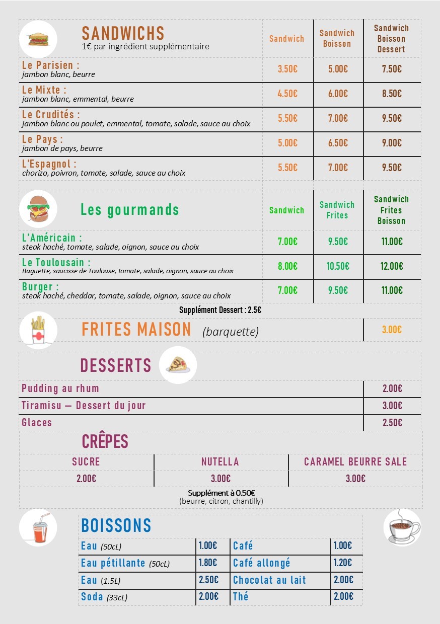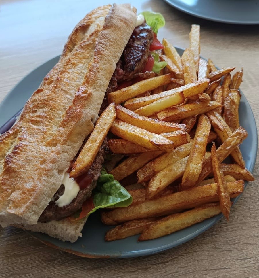 Au menu : pizzas savoureuses, burgers généreux accompagnés de frites maison, ainsi qu’un choix de boissons chaudes et fraîches. Pour une touche sucrée, laissez-vous tenter par des desserts maison et des glaces rafraîchissantes. La carte évolue régulièrement avec des burgers exclusifs, et sur commande, il est possible de commander des plaques de pizza pour vos repas entre amis ou en famille.